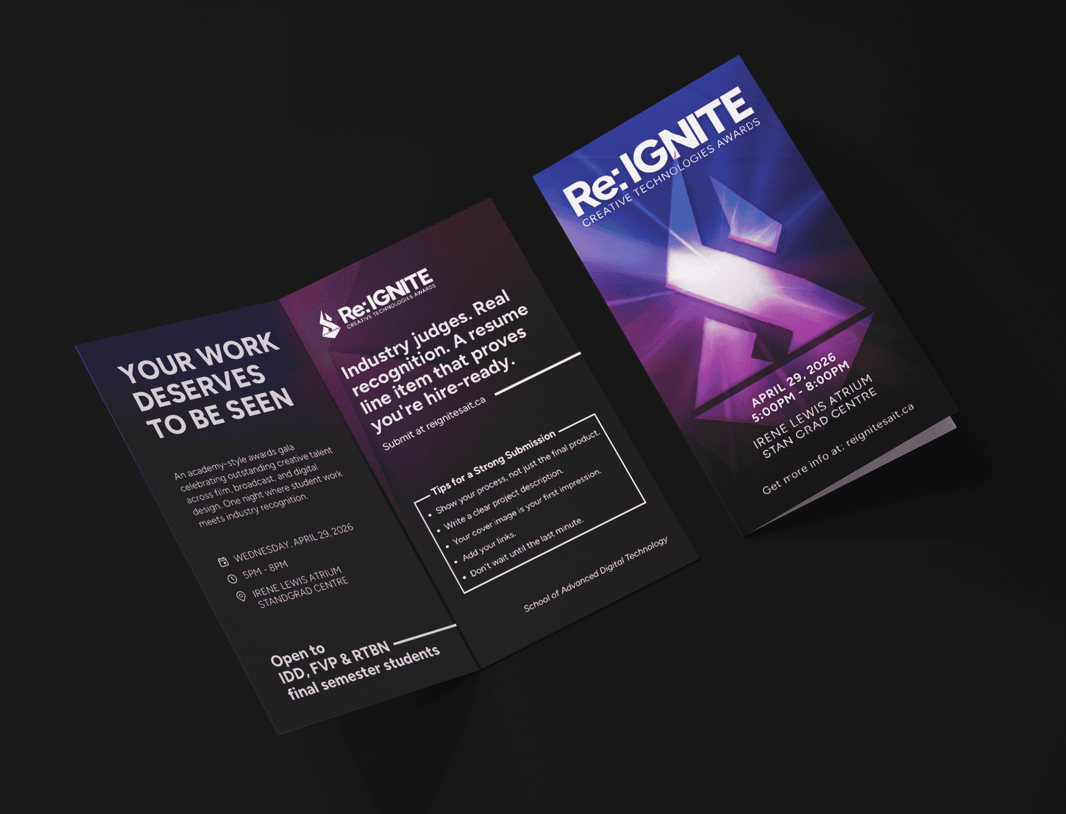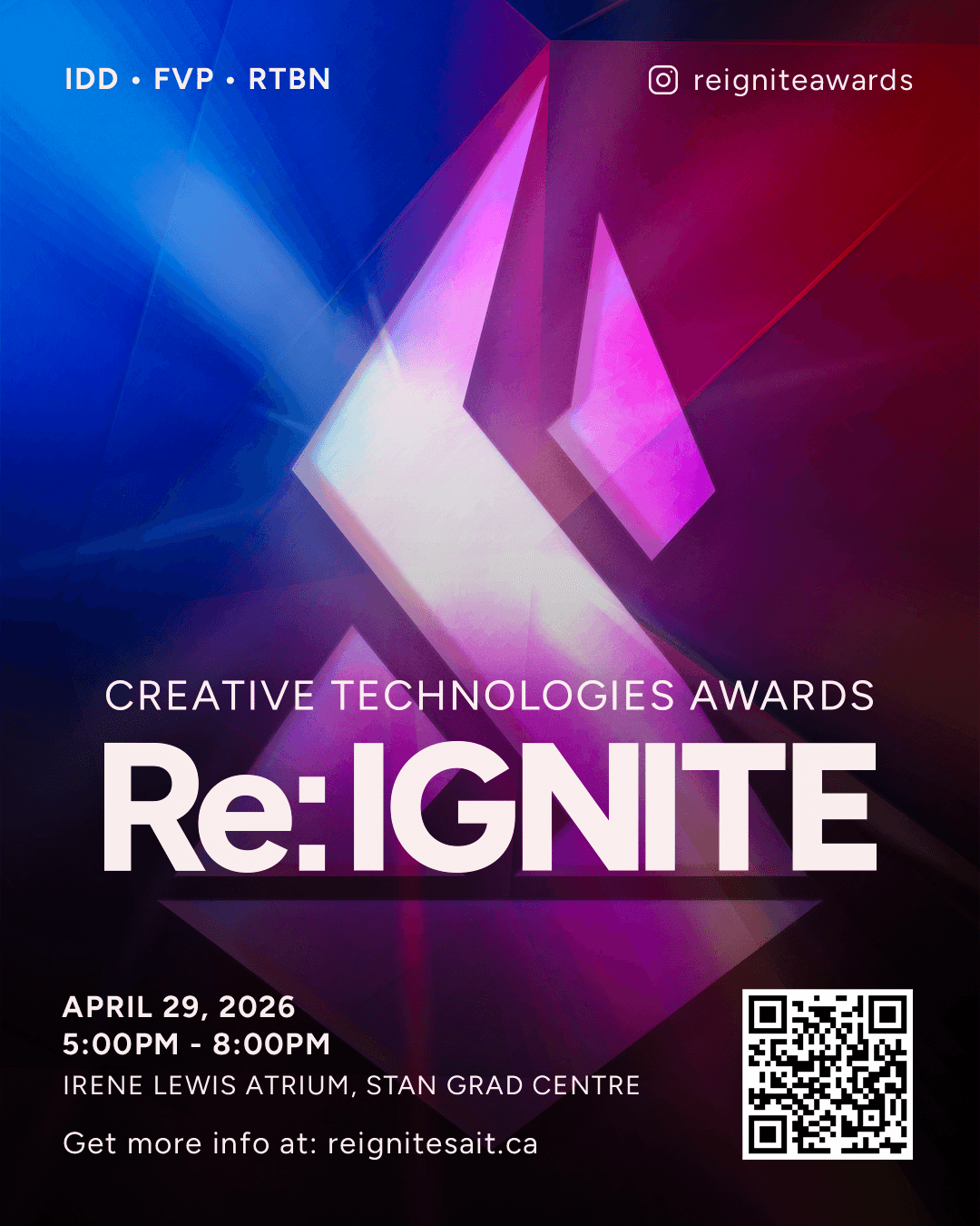 Re: IGNITE Creative Technologies Awards is SADT's annual flagship event celebrating outstanding student work across three program streams - Interactive Design (IDD), Film & Video Production (FVP), and Radio Television & Broadcast News (RTBN).